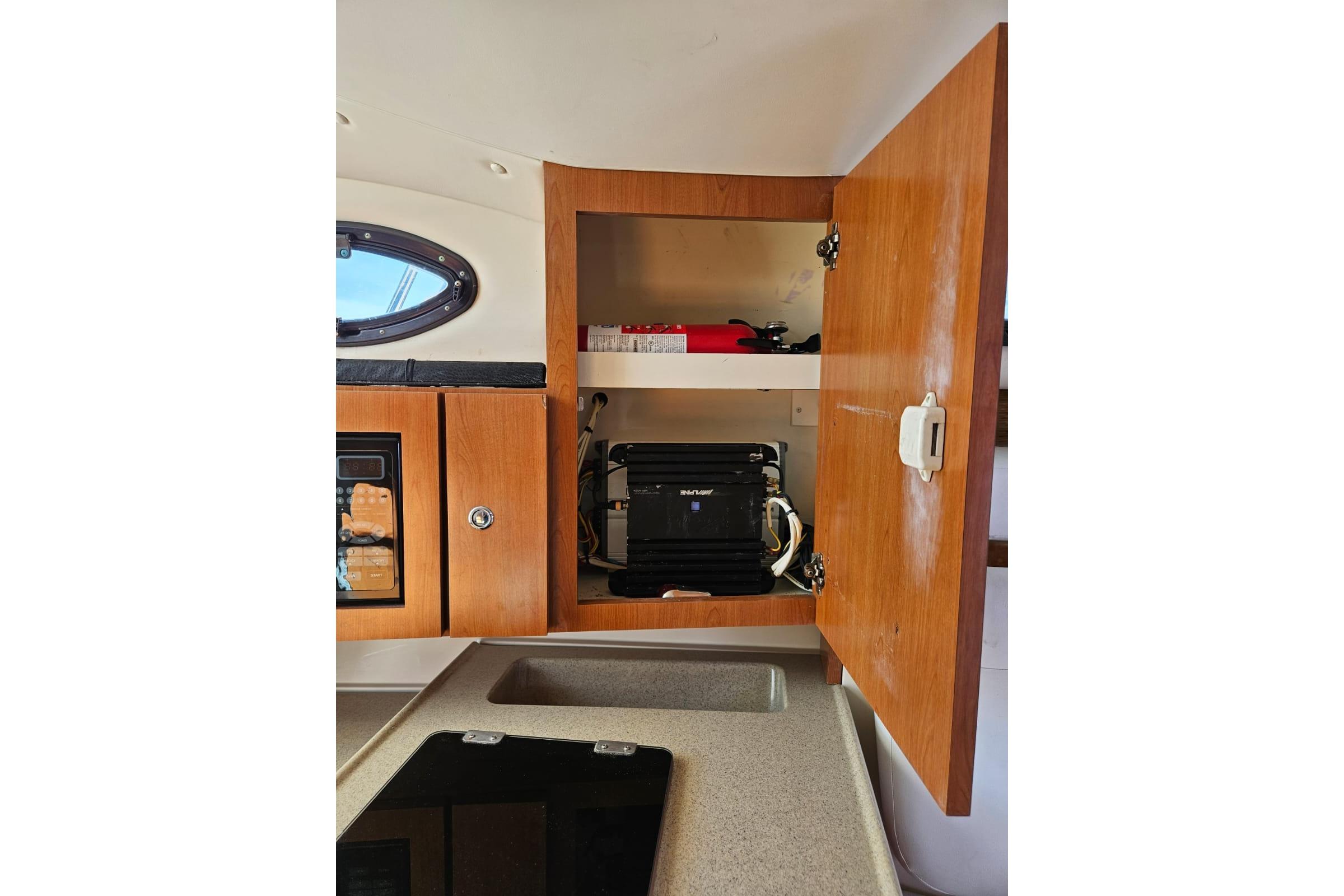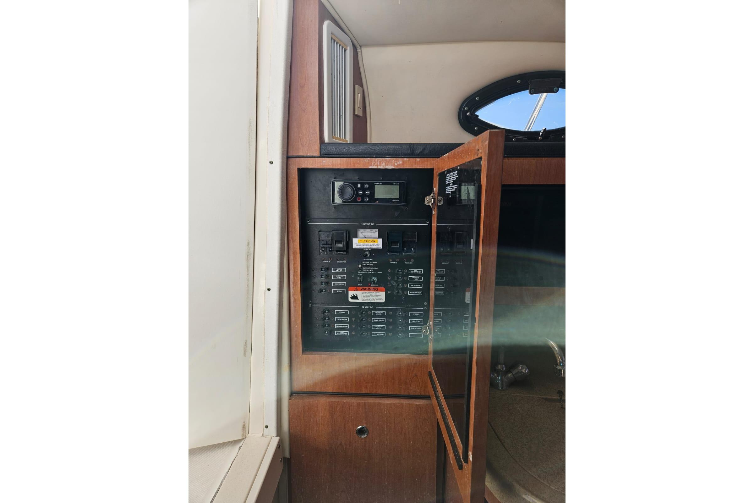 Entertainment is handled by a Fusion stereo system with multiple JL Audio speakers, delivering excellent sound throughout the vessel.