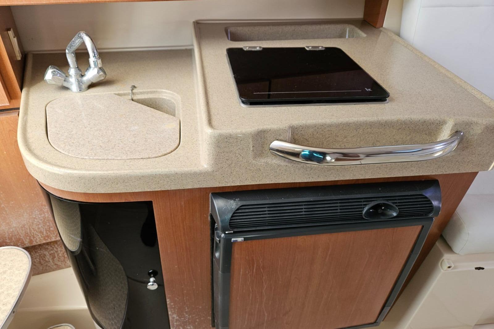 The vessel is well equipped for comfort and overnighting, featuring a 42-gallon freshwater tank, an 11-gallon holding tank, and a 225-gallon fuel tank, providing excellent range and usability.